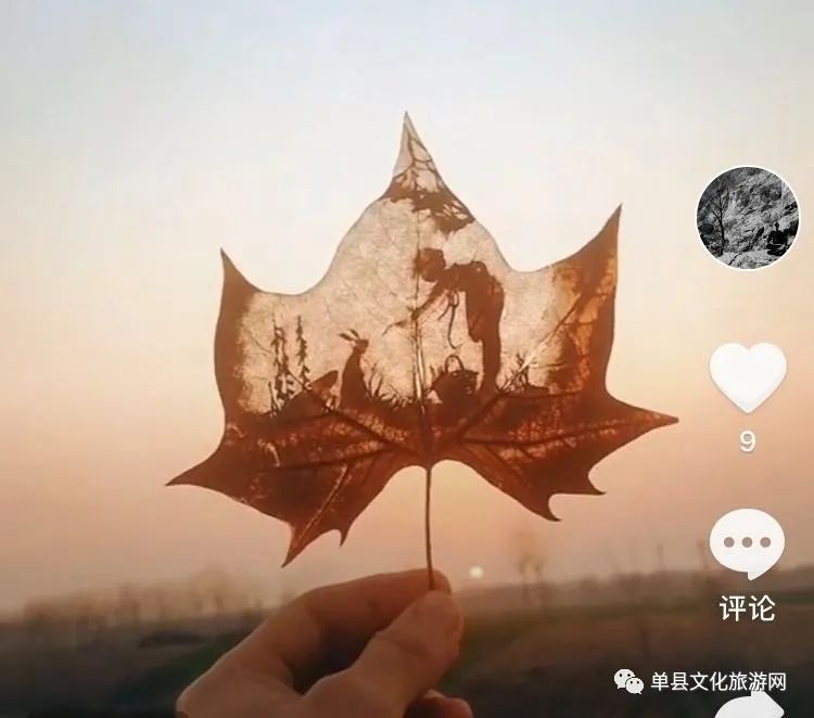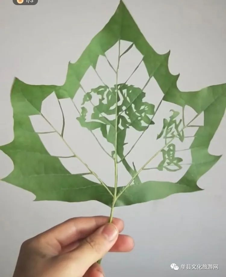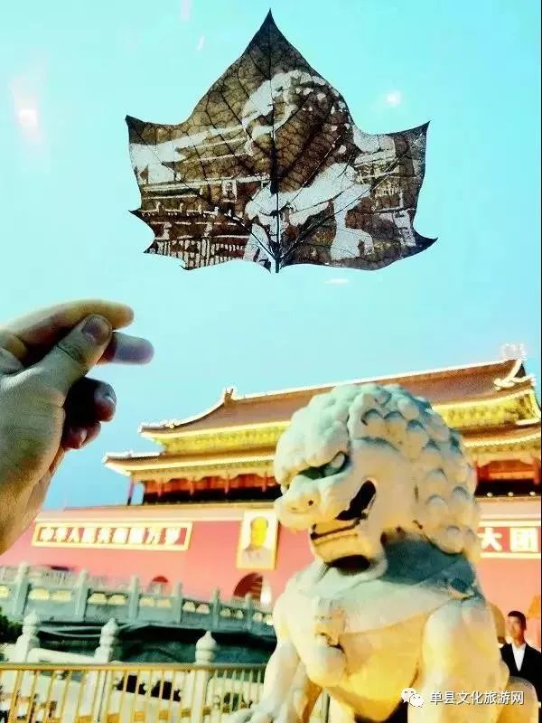 叶雕是在一片树叶上,灵活运用一把锐利的小刀和一把柔软的毛刷,镂刻叶面,刷除叶肉,遗留纵横交织、纤弱细致的脉络,形成立体、深邃、张弛、明暗、含蓄的人间风物创作的艺术效果,让自然残败的叶子重新焕发出生命的状态。