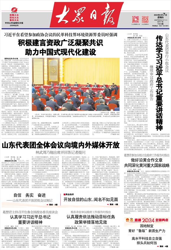 本报北京3月6日电 今天下午,十四届全国人大二次会议山东代表团举行全体会议,继续审议政府工作报告,审查计划报告和草案、预算报告和草案。根据大会安排,本次会议向境内外媒体开放。山东代表团团长林武主持并回答记者提问,副团长周乃翔回答记者提问,副团长杨东奇出席。
