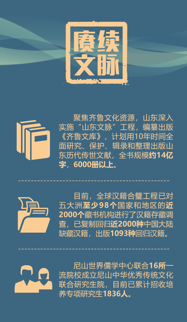 聚焦齐鲁文化资源,山东深入实施“山东文脉”工程,编纂出版《齐鲁文库》,计划用10年时间全面研究、保护、辑录和整理出版山东历代传世文献,全书规模约14亿字,6000册以上。