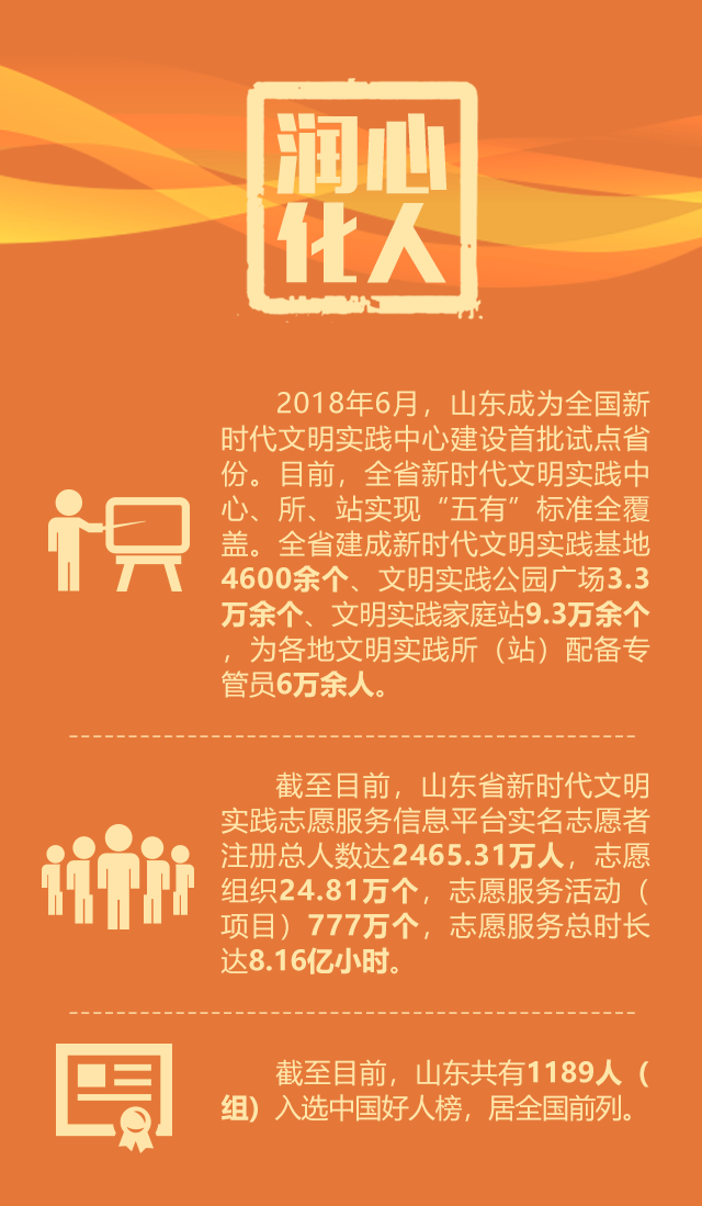 乡村儒学讲堂里,学习氛围浓厚;“小戏小剧”舞台上,演绎百姓身边的美德故事;文明实践站里,飘出幸福的歌声;简约集体婚礼,彰显年轻人个性化新追求;千余名“中国好人”,擦亮“厚道山东人”金招牌……