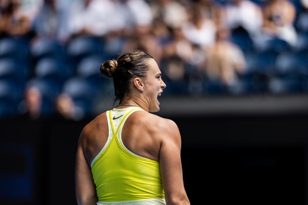 1月15日,萨巴伦卡在比赛中庆祝得分。新华社发(胡泾辰摄)