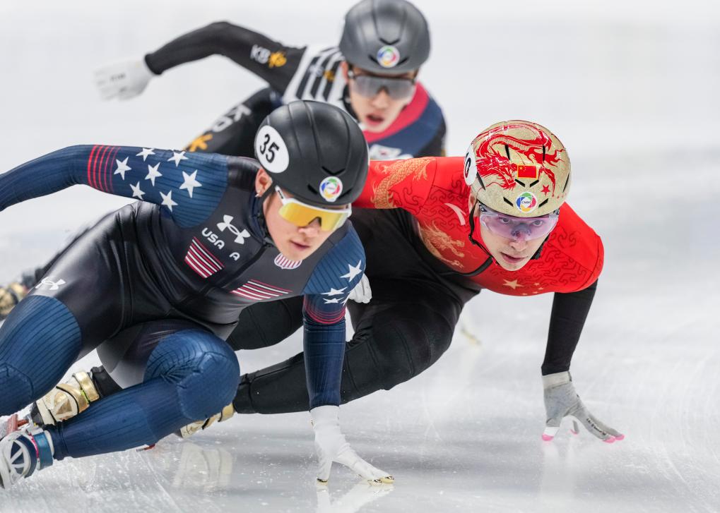 3月16日,孙龙(左二)在2025年国际滑联世界短道速滑锦标赛男子1000米A组决赛中。新华社记者 孙非 摄