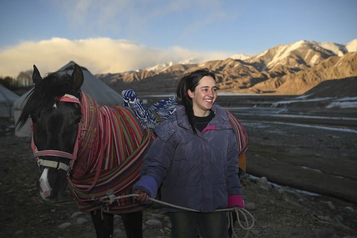 高原春寒料峭,比赛当天早上,气温低至零下10摄氏度。天不亮,她就裹好棉服,戴上护脸巾,牵着马匹来回热身。一如她平日里驯马时那样,一人一马,行进在旷野上。马蹄踩过石头,蹄铁撞击出清亮的声响,回荡在耳边。