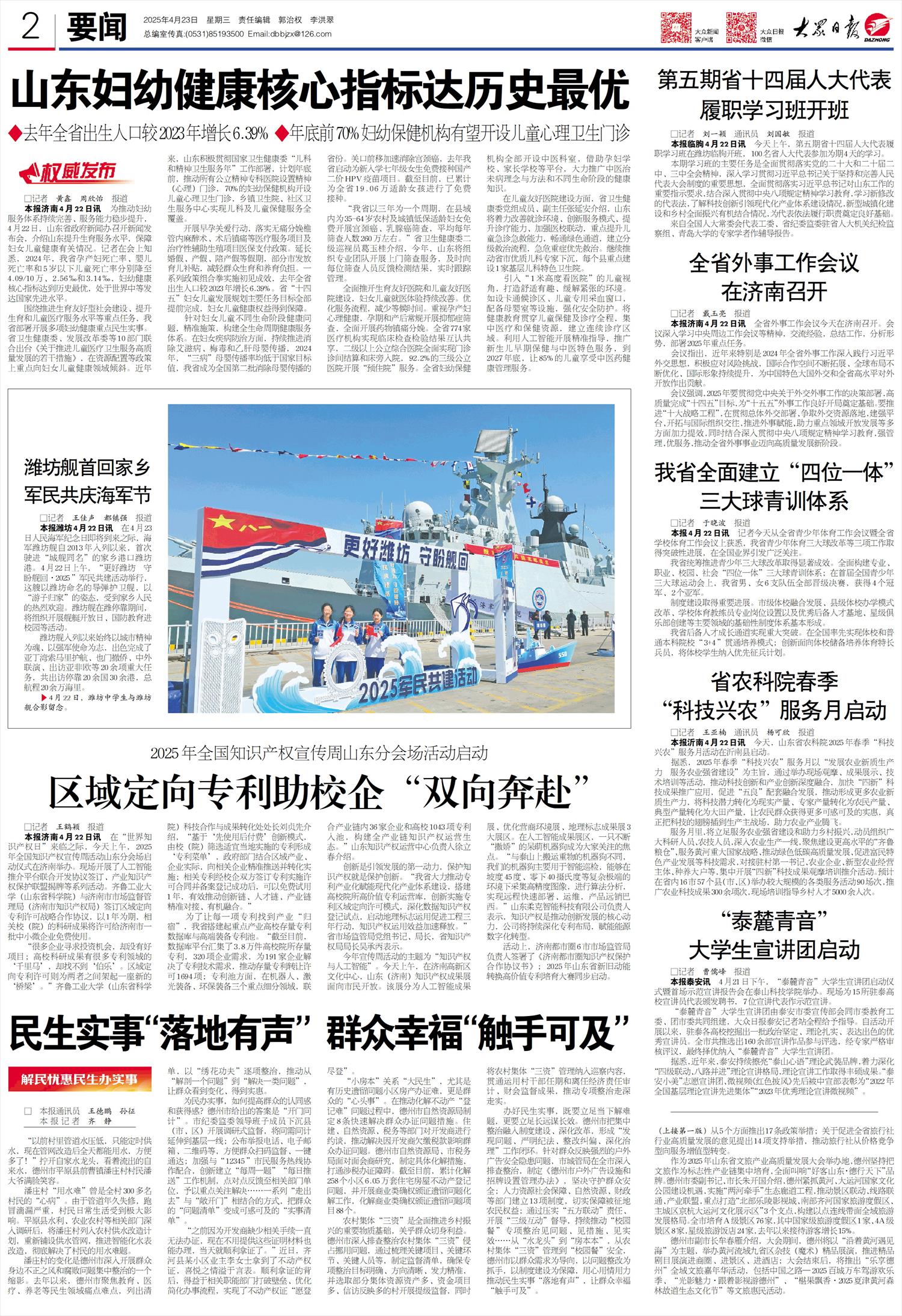 本报济南4月22日讯 为推动妇幼服务体系持续完善、服务能力稳步提升,4月22日,山东省政府新闻办召开新闻发布会,介绍山东提升生育服务水平,保障妇女儿童健康有关情况。记者在会上知悉,2024年,我省孕产妇死亡率、婴儿死亡率和5岁以下儿童死亡率分别降至4.09/10万、2.56‰和3.14‰,妇幼健康核心指标达到历史最优,处于世界中等发达国家先进水平。 围绕推进生育友好型社会建设、提升生育和儿童医疗服务水平等重点任务,我省部署开展多项妇幼健康重点民生实事。省卫生健康委、发展改革委等10部门联合出台《关于推进儿童医疗卫生服务高质量发展的若干措施》,在资源配置等政策上重点向妇女儿童健康领域倾斜。近年来,山东积极贯彻国家卫生健康委“儿科和精神卫生服务年”工作部署,计划年底前,推动所有公立精神专科医院设置精神(心理)门诊,70%的妇幼保健机构开设儿童心理卫生门诊,乡镇卫生院、社区卫生服务中心实现儿科及儿童保健服务全覆盖。