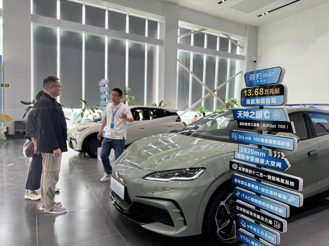 4月26日,在比亚迪汽车海洋网乾元新景4S店,前来看车、试驾、提车的顾客络绎不绝,展厅经理张利军忙着为试驾的顾客预约,“今天是休息日,来看车的客户比较多,预约需要排队等待。”