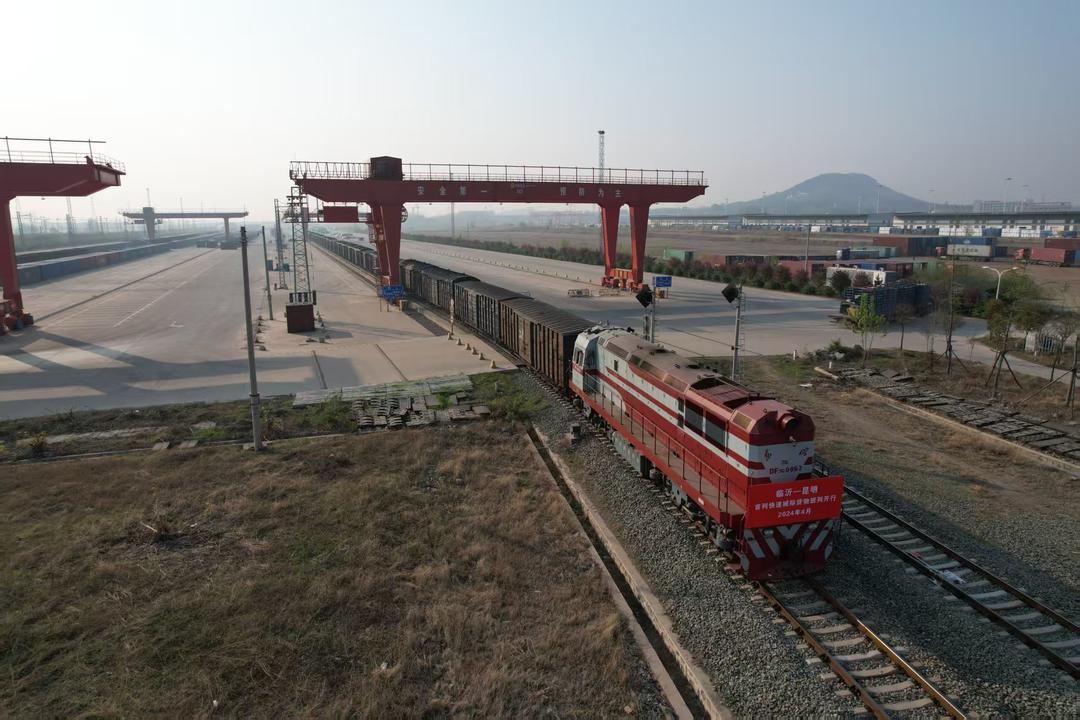 4月11日,在山东临沂济铁物流园,中欧班列满载货物发往俄罗斯。