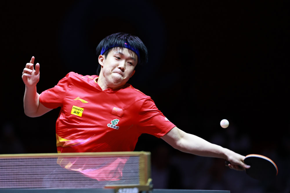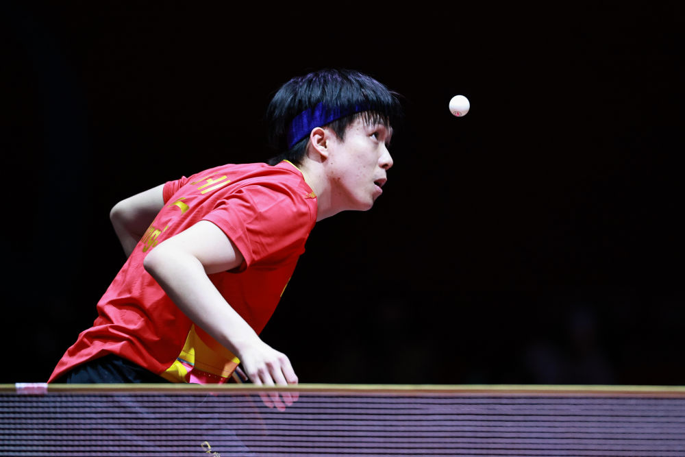5月17日,王楚钦在比赛中回球。(新华社记者 刘续 摄)
