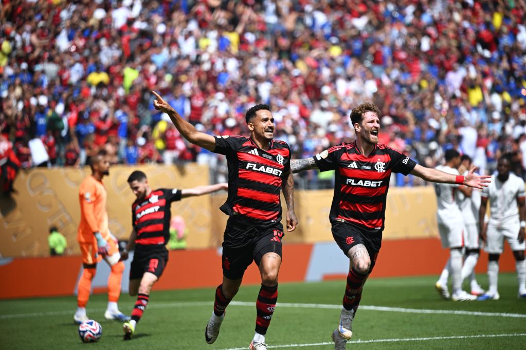 6月20日,弗拉门戈队球员达尼洛(前左)进球后庆祝。当日,在美国宾夕法尼亚州费城举行的2025年国际足联俱乐部世界杯(世俱杯)小组赛D组比赛中,巴西弗拉门戈队3比1战胜切尔西队。新华社记者 吴晓凌 摄