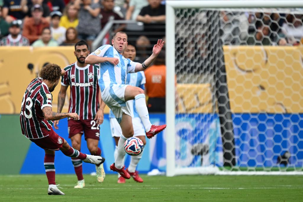 6月21日,弗鲁米嫩塞队球员古加(左)在比赛中射门。当日,在美国新泽西州举行的2025年国际足联俱乐部世界杯(世俱杯)小组赛F组比赛中,巴西弗鲁米嫩塞队4比2战胜韩国蔚山现代队。新华社记者 李睿 摄