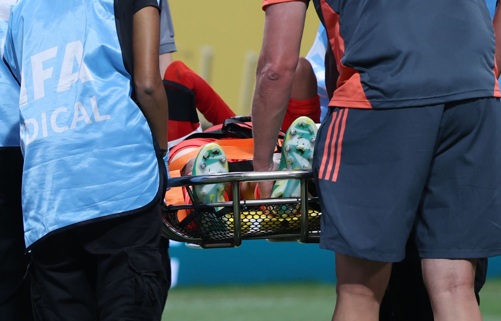 7月5日,拜仁慕尼黑队医护人员用手扶住穆西亚拉受伤的脚踝。新华社记者 李明 摄