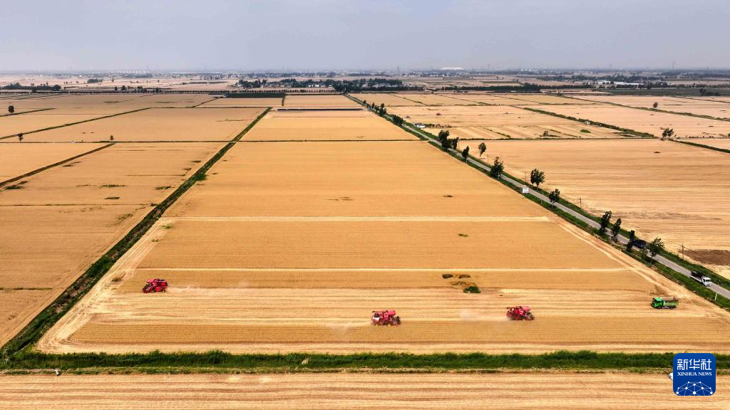 2025年6月5日,在嘉祥县仲山镇,收割机在收获小麦(无人机照片)。
