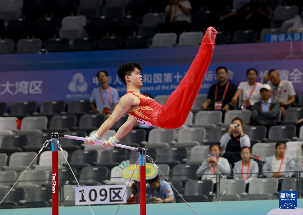 9月9日,广西队选手杨兰斌在双杠比赛中。最终,他获得个人全能冠军。