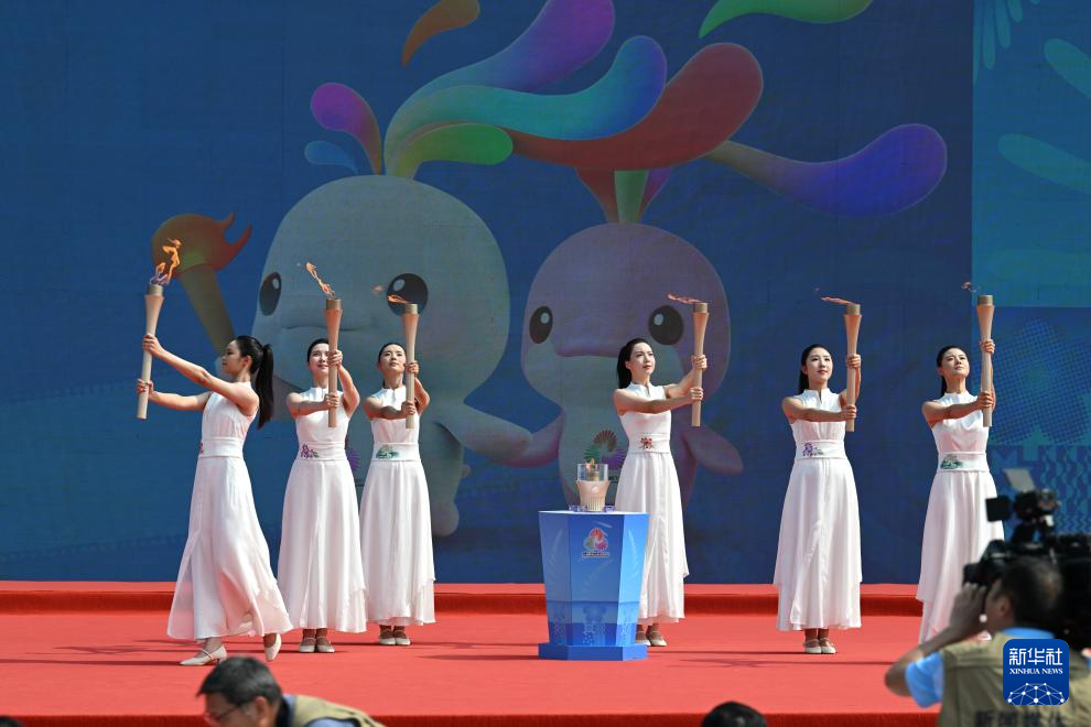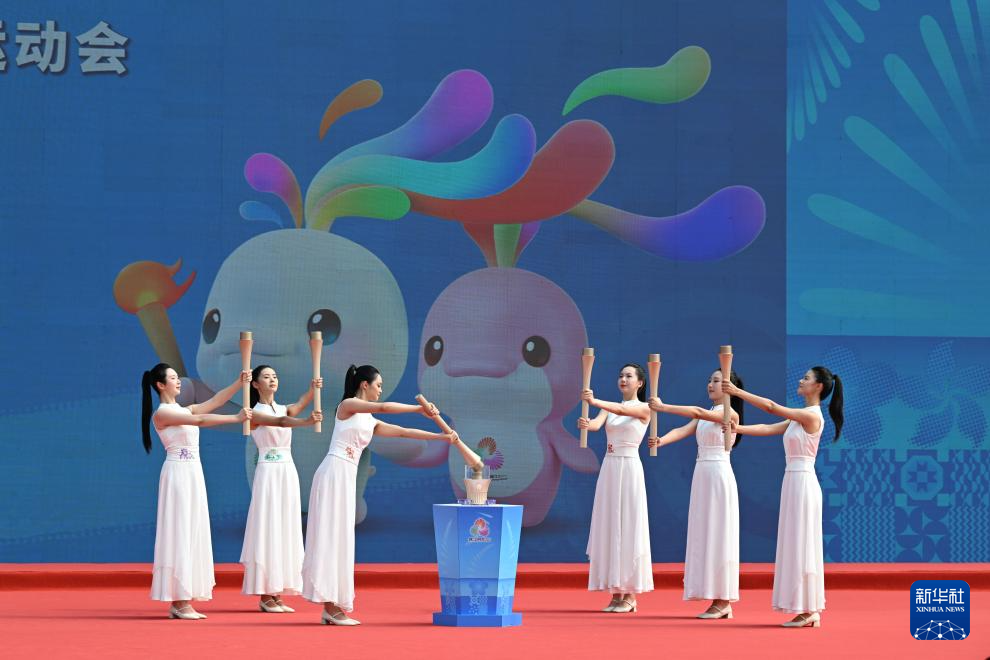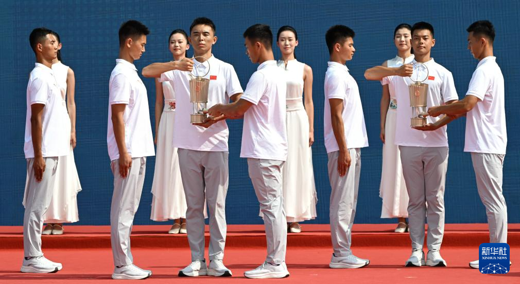 10月9日,参与火种采集仪式的嘉宾点燃十五运会和残特奥会圣火。
