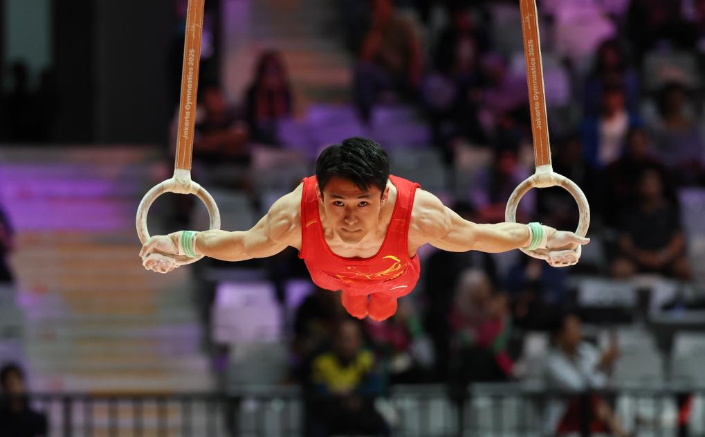 10月22日,中国选手侍聪在男子个人全能决赛吊环项目比赛中。新华社记者 白雪飞 摄