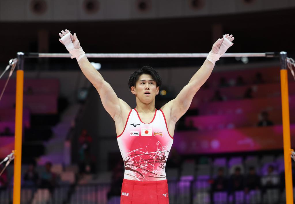 10月22日,日本选手桥本大辉在男子个人全能决赛单杠项目比赛后。新华社记者 白雪飞 摄