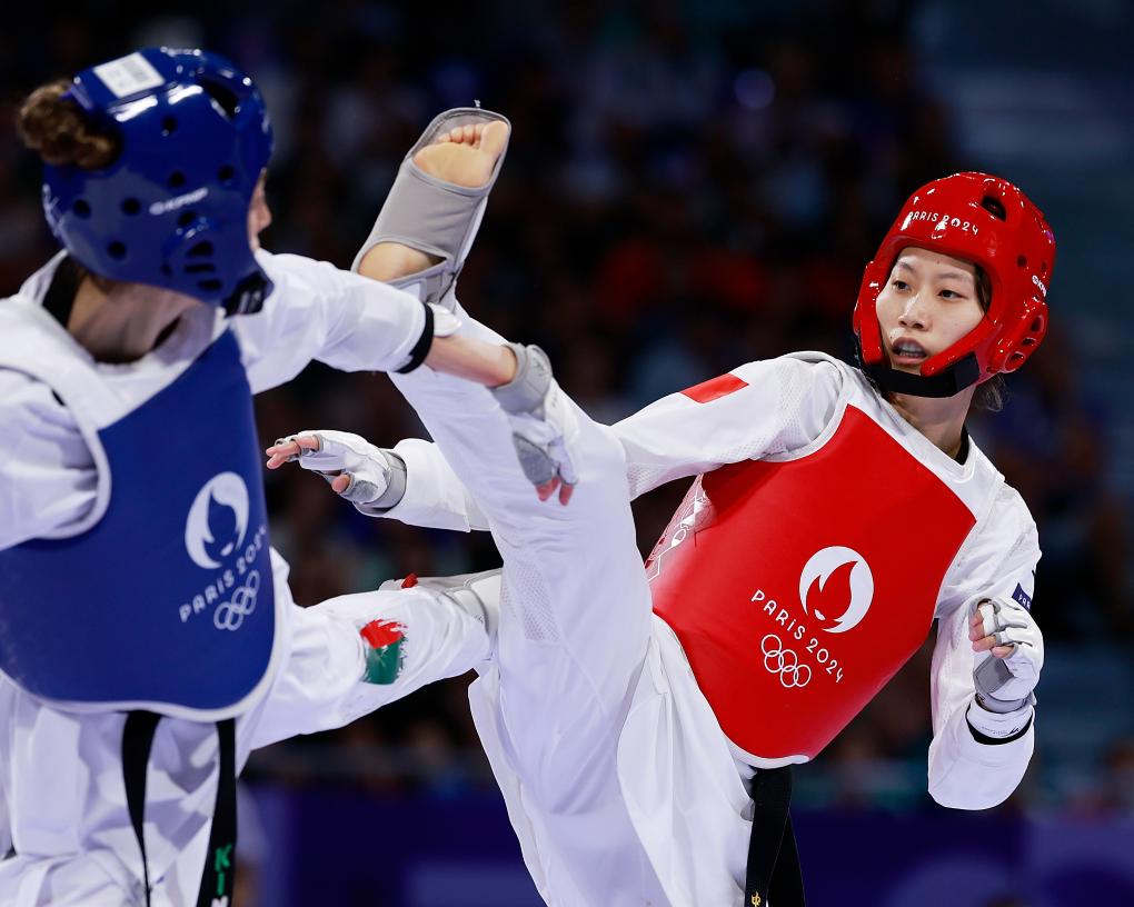 2024年8月8日,中国选手骆宗诗(右)在巴黎奥运会跆拳道项目女子57公斤级铜牌赛上。新华社记者 费茂华 摄