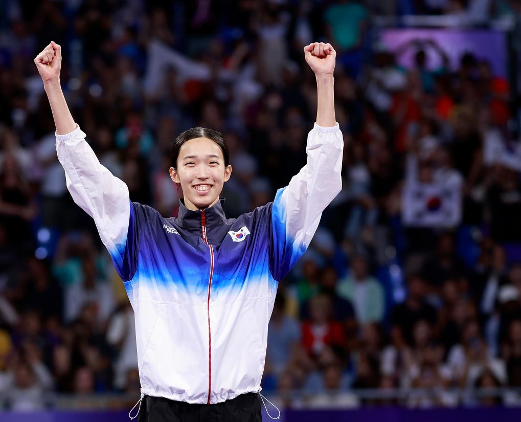 2024年8月8日,获得冠军的韩国选手金宥珍在巴黎奥运会跆拳道女子57公斤级决赛颁奖仪式上。新华社记者 费茂华 摄