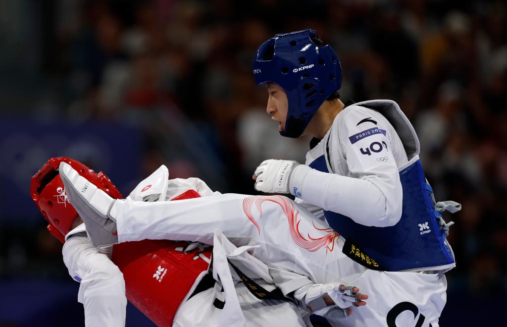 2024年8月8日,中国选手梁育帅(右)在巴黎奥运会跆拳道男子68公斤级16强赛上。新华社记者 费茂华 摄