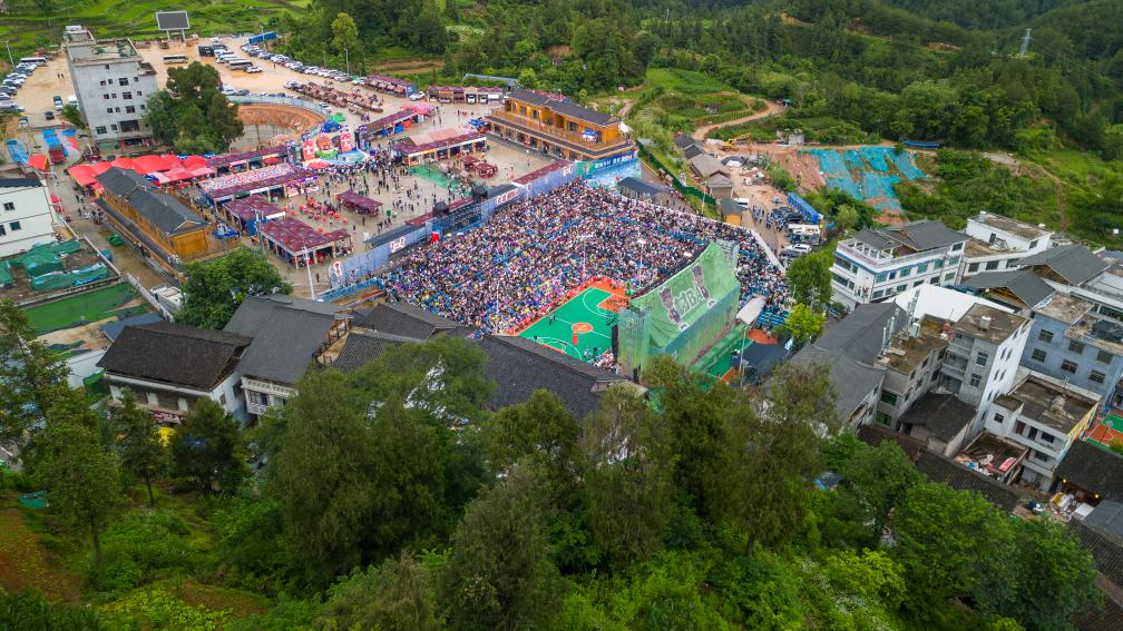 这是2024年6月9日拍摄的全国民族团结篮球邀请赛现场(无人机照片)。当日,第十二届全国少数民族传统体育运动会“同心畅享”系列活动之一的全国民族团结篮球邀请赛在贵州省黔东南苗族侗族自治州台江县台盘村开赛。揭幕战在贵州道真队和河北宁晋队之间展开。新华社发(龙建睿摄)