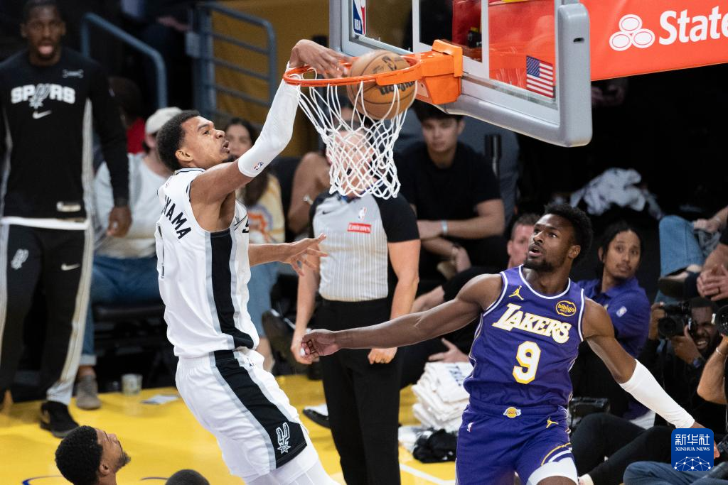 11月5日,马刺队球员维克托·文班亚马(左)在比赛中扣篮。