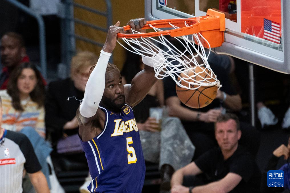 11月5日,湖人队球员德安德烈·艾顿在比赛中扣篮。
