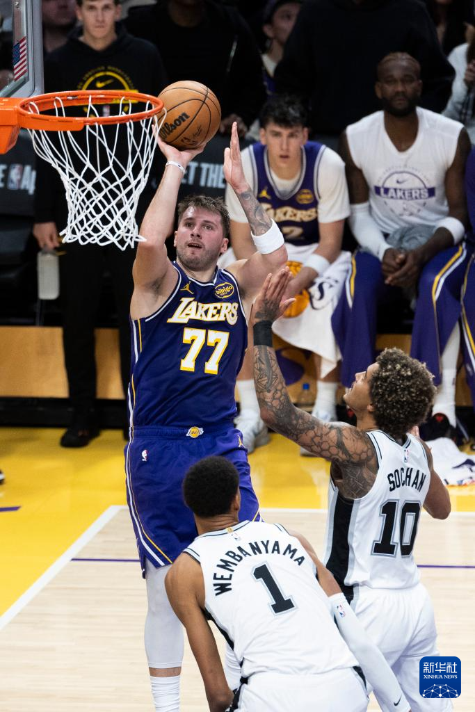 11月5日,湖人队球员卢卡·东契奇(右)在比赛中投篮。