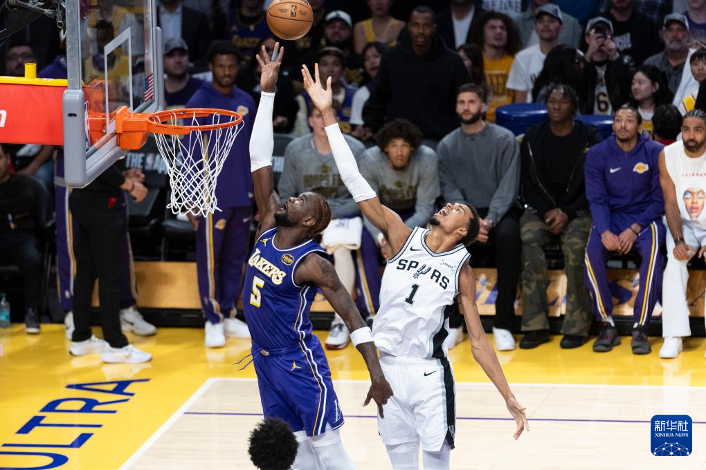 11月5日,湖人队球员八村塁(上左)与马刺队球员维克托·文班亚马(上右)在比赛中争抢篮板球。