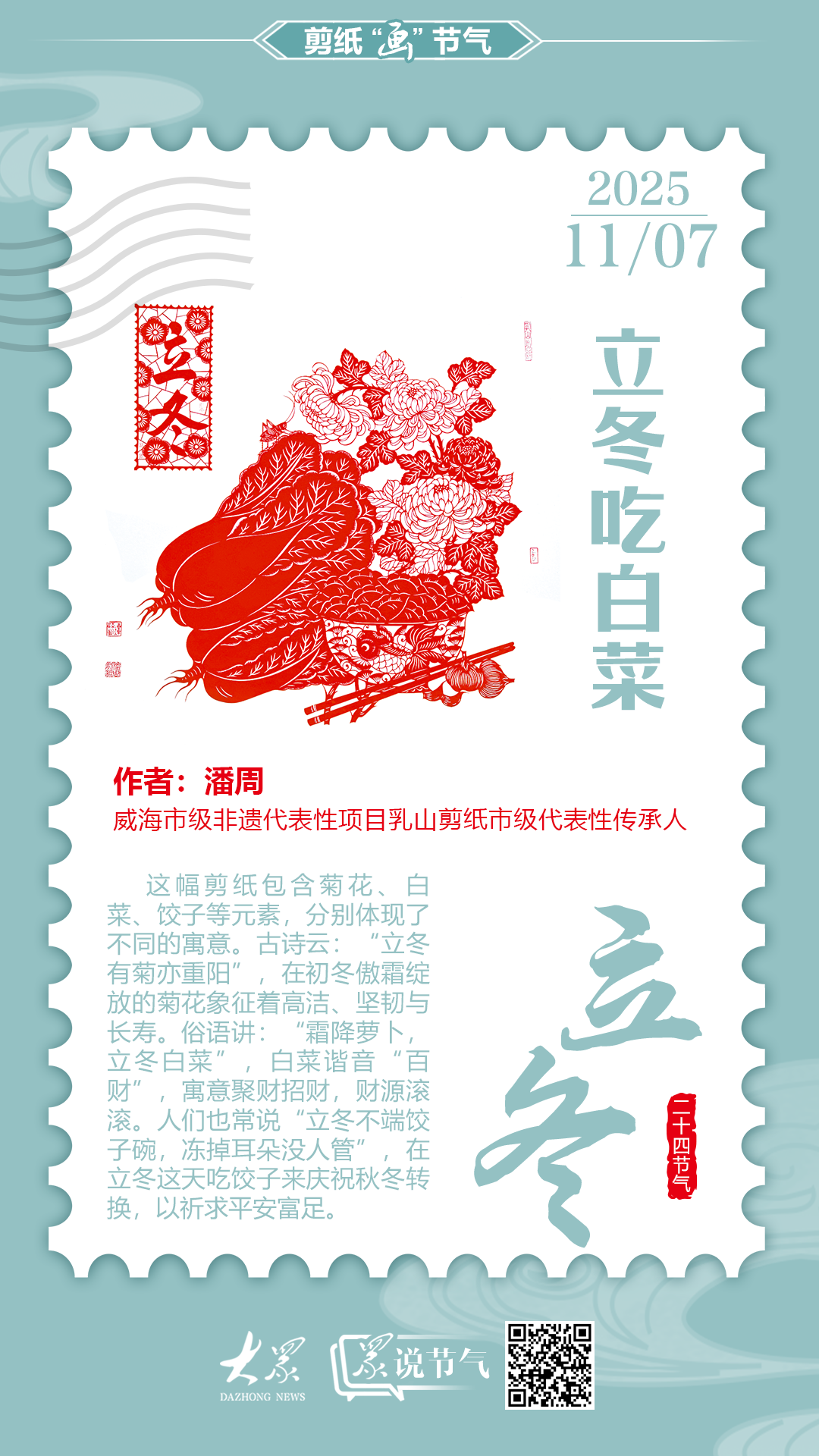 作品介绍:这幅剪纸包含菊花、白菜、饺子等元素,分别体现了不同的寓意。古诗云:“立冬有菊亦重阳”,在初冬傲霜绽放的菊花象征着高洁、坚韧与长寿。俗语讲:“霜降萝卜,立冬白菜”,白菜谐音“百财”,寓意聚财招财,财源滚滚。人们也常说“立冬不端饺子碗,冻掉耳朵没人管”,在立冬这天吃饺子来庆祝秋冬转换,以祈求平安富足。