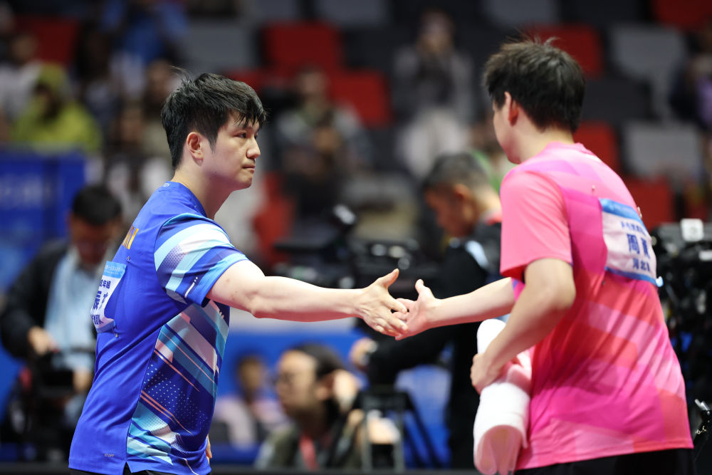 11月10日,樊振东(左)在比赛后和周雨握手。新华社记者 刘续 摄