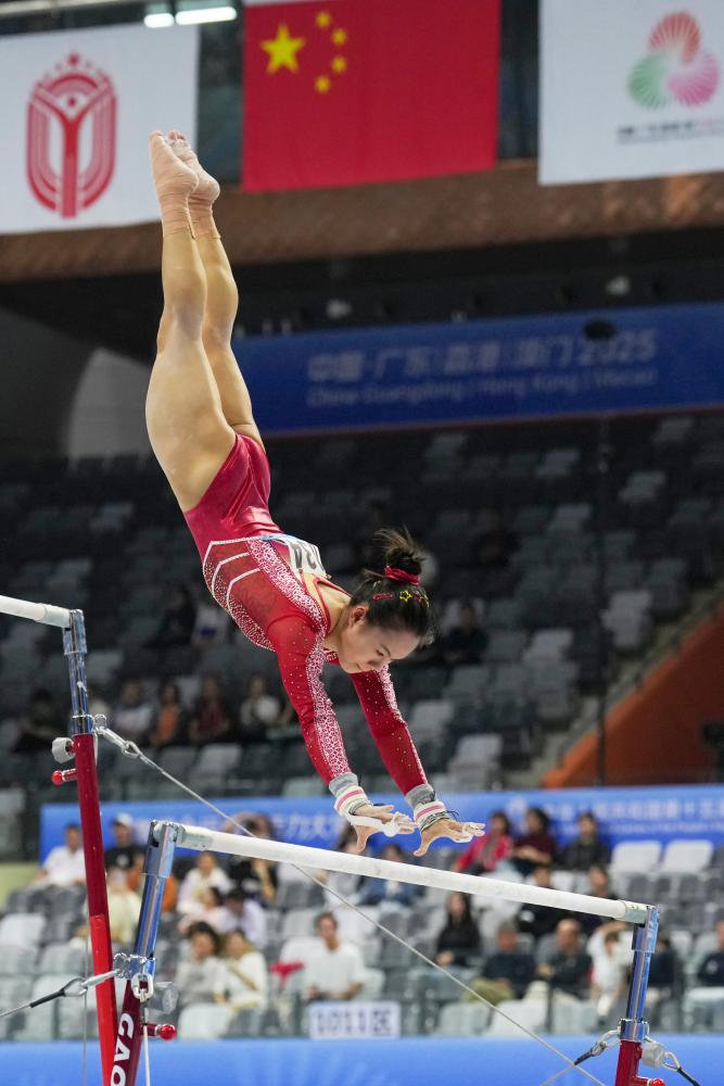 11月13日,浙江队选手张清颖在高低杠比赛中。新华社记者 胥冰洁 摄