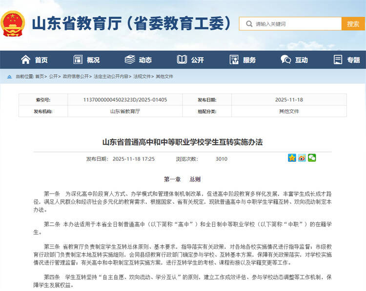 齐鲁网·闪电新闻11月19日讯 为推动高中阶段教育多样化发展、以职普融通拓宽学生成长成才通道,山东省教育厅印发《山东省普通高中和中等职业学校学生互转实施办法》,具体内容一起来看。