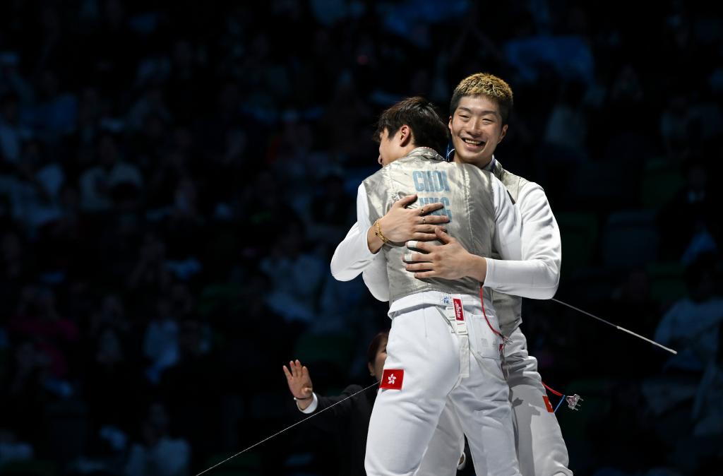 11月19日,香港队选手张家朗(右)和队友蔡俊彦在比赛后相拥庆祝夺冠。新华社记者 胡虎虎 摄