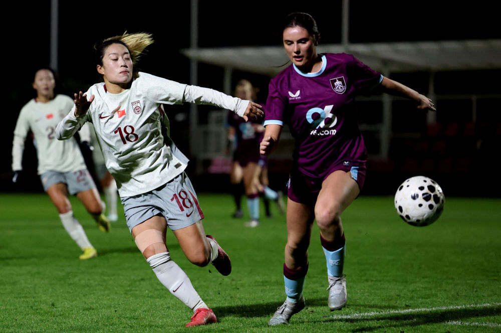 11月24日,中国队球员唐佳丽(前左)与伯恩利队球员拼抢。新华社记者 李颖 摄
