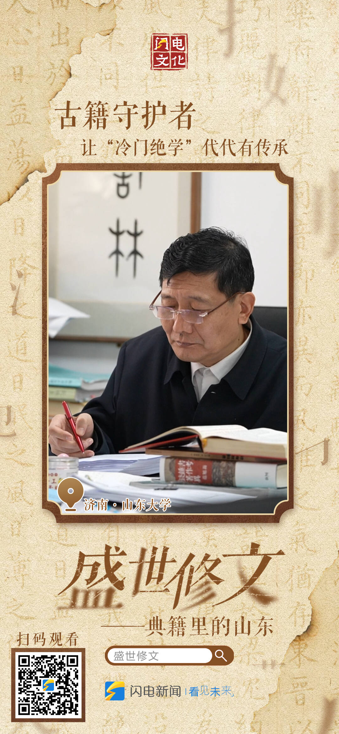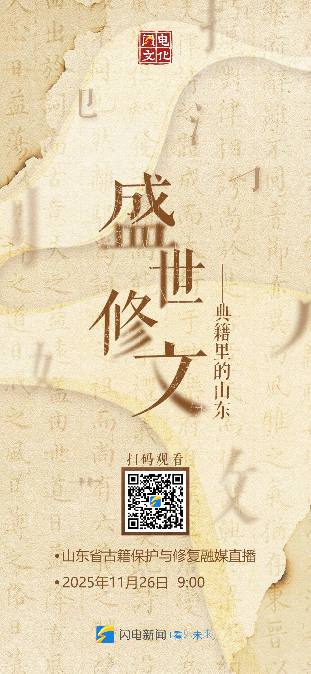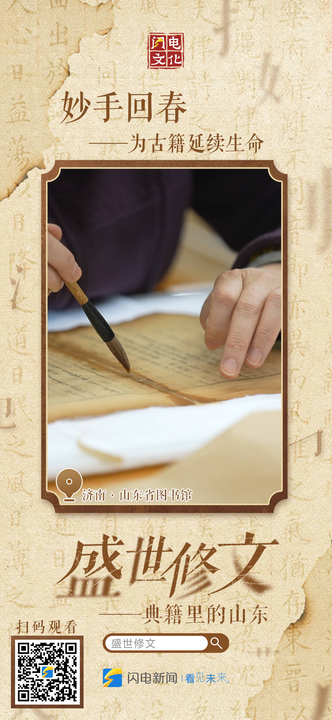 齐鲁网·闪电新闻11月25日讯盛世修文,文载盛世。11月26日9:00,闪电新闻策划推出“盛世修文——典籍里的山东”大型融媒直播,从山东大学对《永乐大典》的整理与学术深耕,到山东省图书馆古籍修复实验室里的本体“救治”;从孔子博物馆珍本典籍的惊艳面世,到山东中医药大学《中华医藏》数字化平台的共建共享;从山东出版集团系统整理出版《齐鲁文库》等鸿篇巨制,到聊城海源阁以“归阁工程”为代表,四代人接力守护古籍……六路记者实地探访,对话一线“修书人”,和您一起沉浸式体验典籍里流淌着的中华文明。