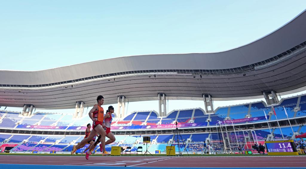 当日,伴随着提振人心的醒狮表演,田径、聋人篮球等项目都在简短的开赛仪式后进入竞赛环节。在广东省奥体中心体育场举行的田径比赛传来捷报,巴黎残奥会两银得主、山东选手郭芊芊在女子400米T35级比赛中,以超世界纪录、破全国纪录的1分14秒65率先冲线。两届残奥会冠军、陕西队的董飞霞在女子铅球F55级比赛中摘下桂冠。在她的鼓励下,陕西队当天一共获得6枚田径金牌。