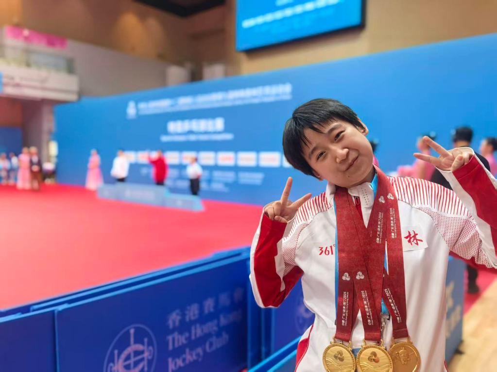 此后,王莹踏上了“收割奖牌”的道路。2016年,她在南京举行的全国特奥乒乓球比赛中摘得女单金牌;2019年,她带病参加天津全国第七届特奥会,斩获2金1铜;2021年陕西全国第八届特奥会,她将混双、女双、女单金牌全部收入囊中,同时拿下团体铜牌。本届残特奥会,她在香港再度收获三金。