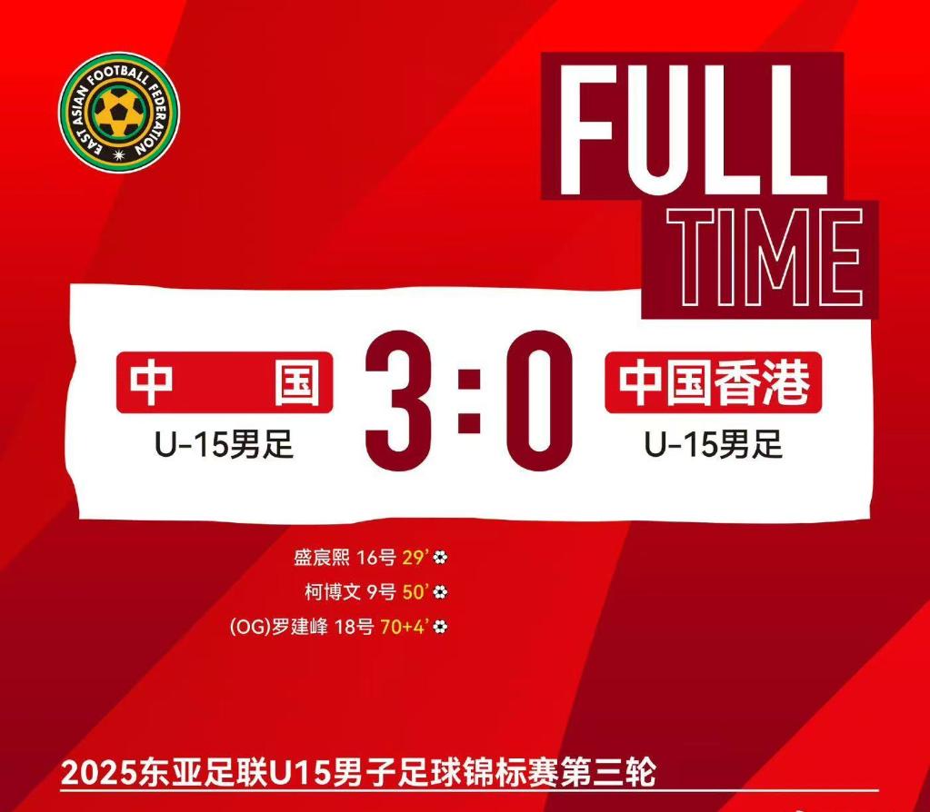 新华社福州12月22日电(记者刘旸)2025东亚足联U15锦标赛22日在福建漳州进行最后一轮比赛,A组的中国U15男足队3:0战胜中国香港队,以一胜一平一负的战绩结束本届赛事。