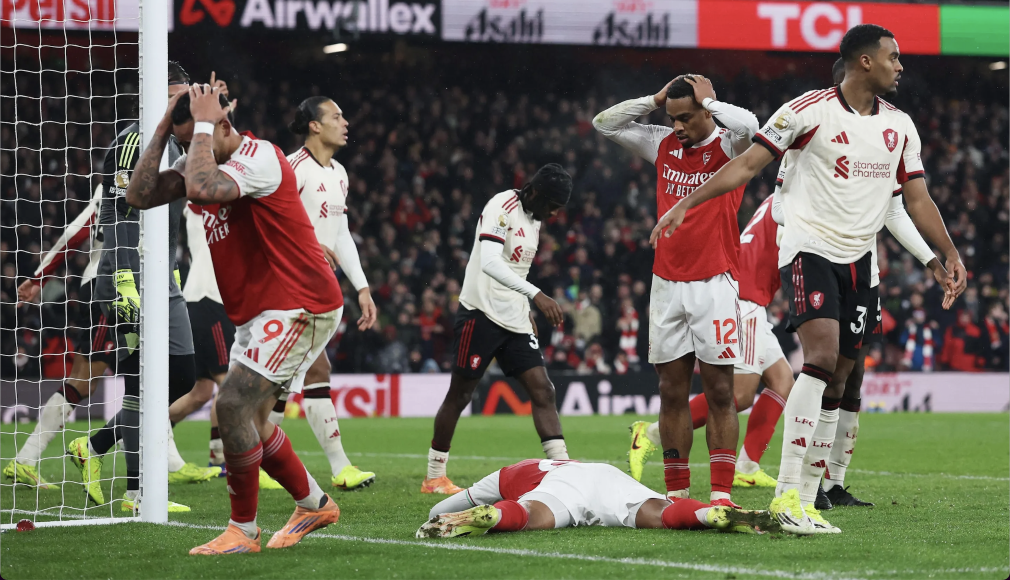 由于争冠对手曼城和阿斯顿维拉在7日的比赛中均被对手逼平,阿森纳本场只要取胜,便可将领先优势扩大到8分。比赛中,阿森纳上半场攻势积极,占据明显优势,多次将球送至门前,但未能完成致命一击。利物浦在第26分钟险些破门,阿森纳后卫萨利巴与门将拉亚配合失误,布拉德利抓住机会起脚挑射,皮球击中横梁弹出。