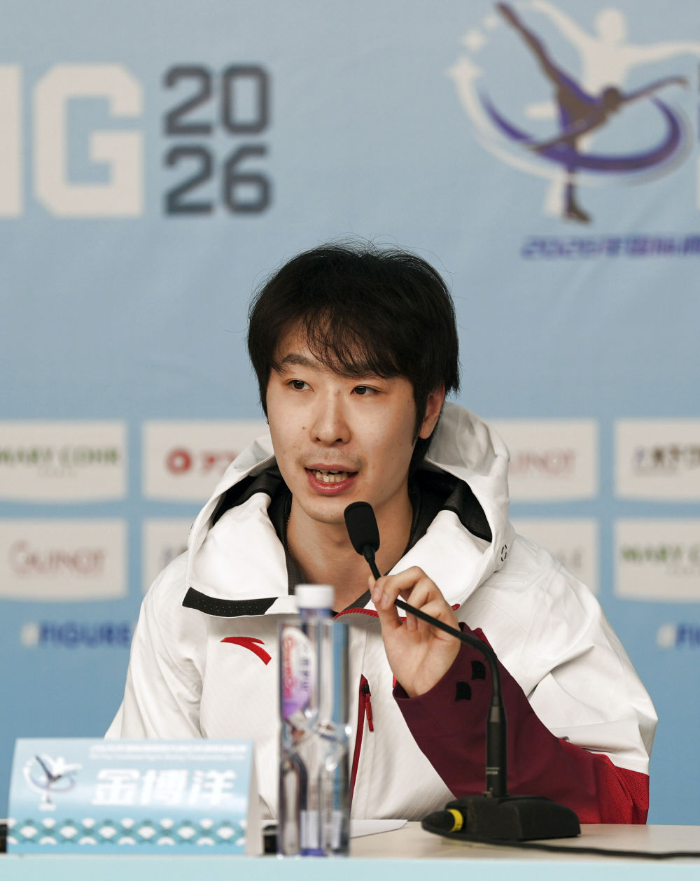 1月15日,中国花样滑冰运动员金博洋在发布会上发言。新华社记者 谢晗 摄