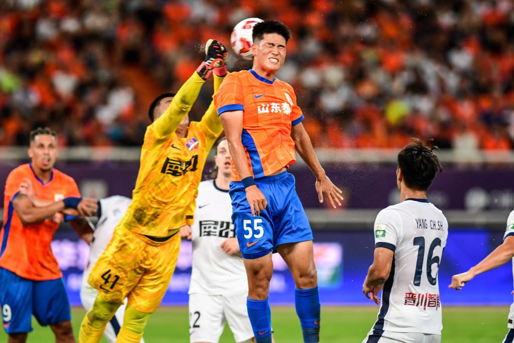 2025年7月27日,山东泰山队球员彭啸(右二)在比赛中争顶。新华社记者 朱峥 摄