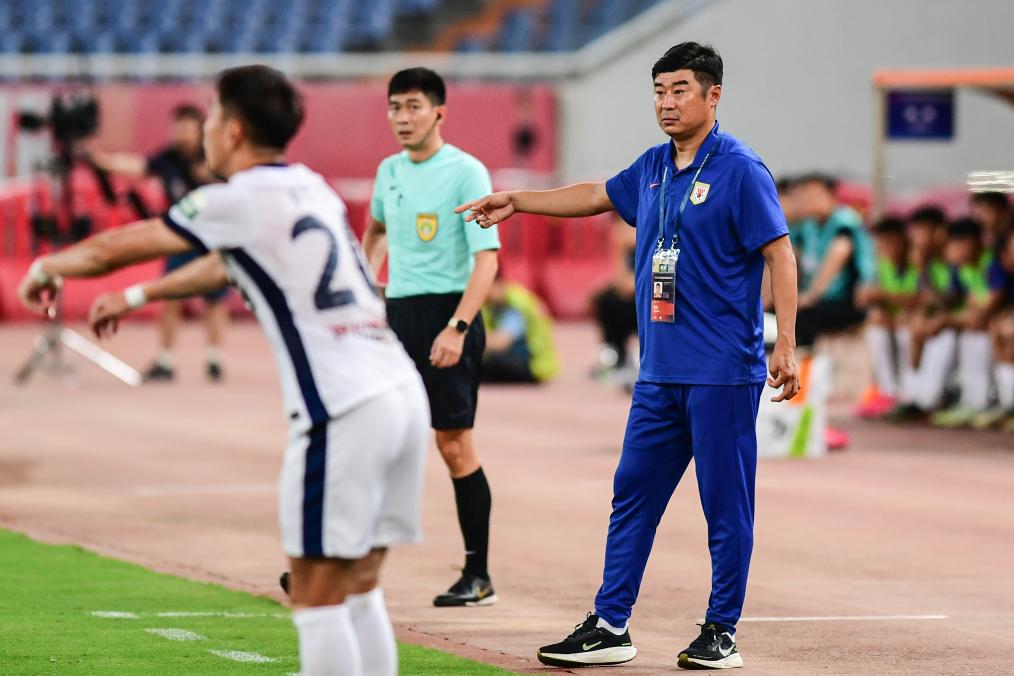 资料图:韩鹏(右)在场边指挥。新华社记者 朱峥 摄