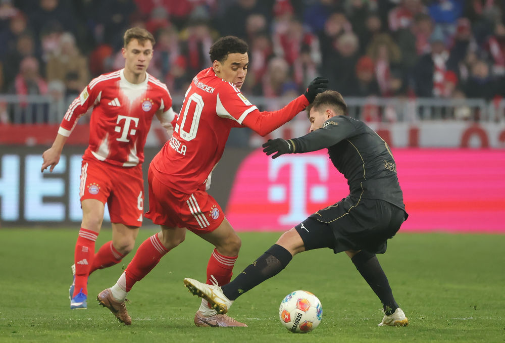 1月24日,拜仁慕尼黑队球员穆西亚拉(中)和奥格斯堡队球员雷治贝察伊(右)在比赛中拼抢。新华社发(菲利普·鲁伊兹摄)