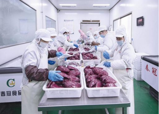 山东春冠食品有限公司工人们对鹅肥肝制品进行分拣、装袋