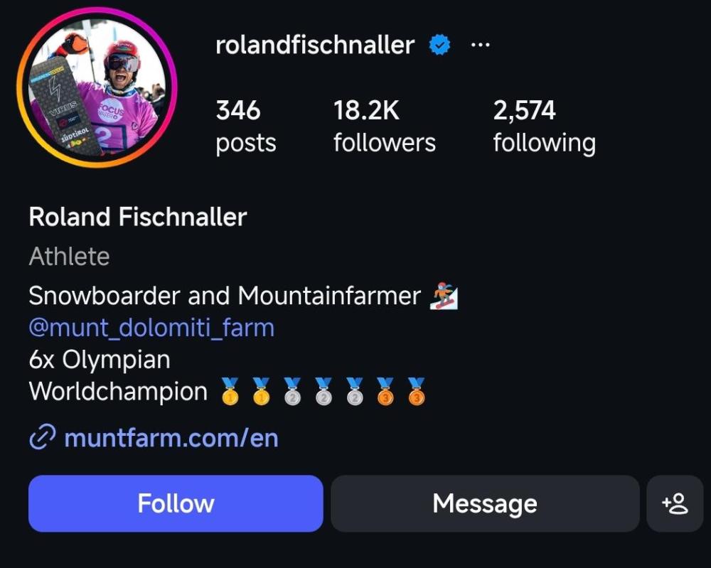 “放牛老哥”并不是一句玩笑,而是一份正经的工作。在自己的个人社交账号主页上,菲施纳勒这样介绍自己:“Snowboarder and Mountainfarmer”。前面的snowboarder不难理解——单板滑雪运动员;而所谓“mountainfarmer”,是阿尔卑斯山区常见的一种职业,指长期在山区从事农牧业及相关经营的人,俗称“山地农牧民”。