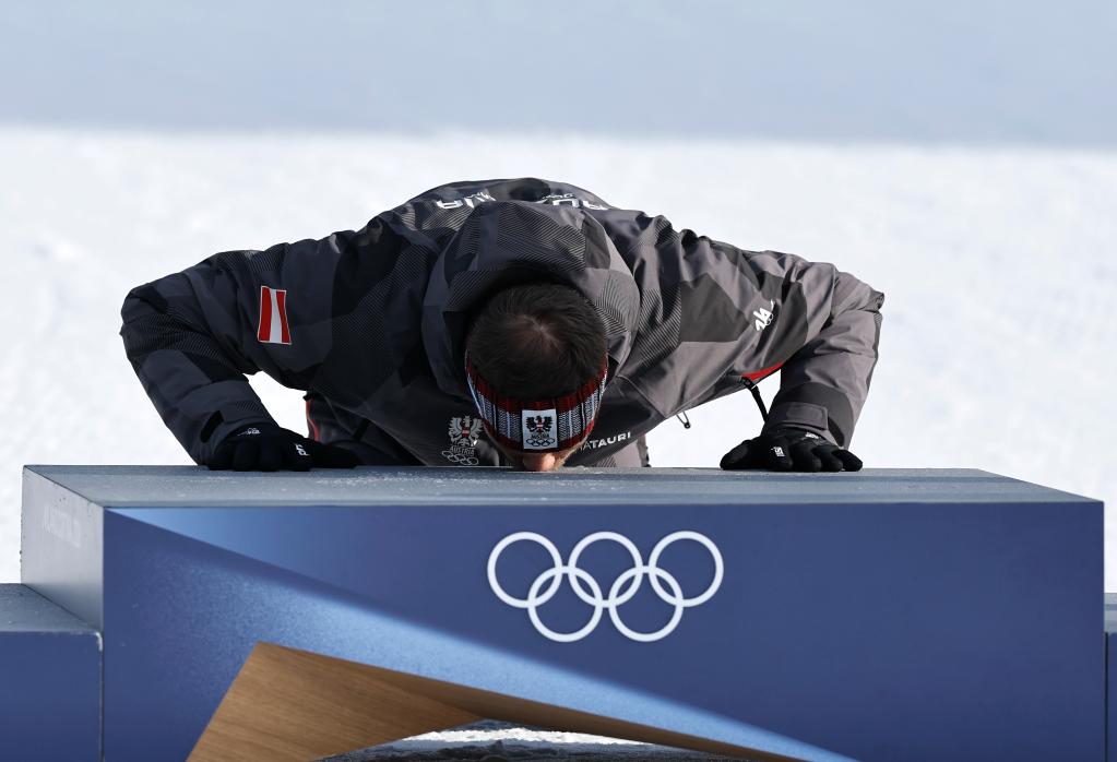 2月8日,冠军奥地利选手本亚明·卡尔在颁奖仪式上亲吻领奖台。新华社记者 王鹏 摄