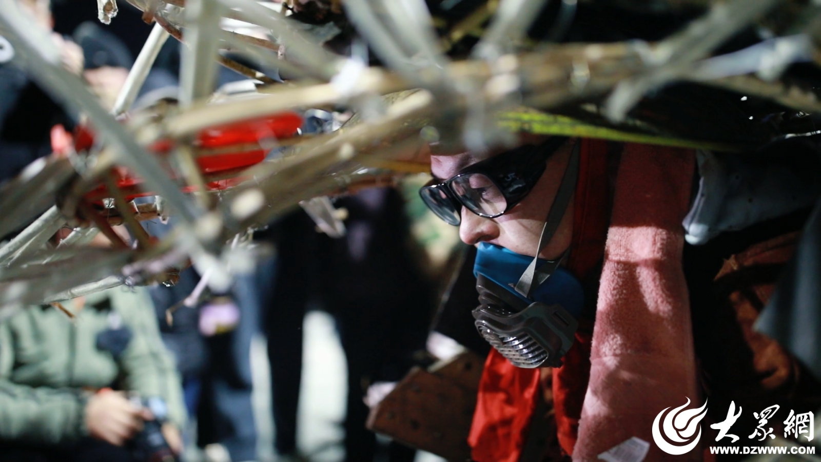 “火虎”表演由顶虎人与打虎人构成,距今已有百余年历史,由邹城市平阳寺村周氏族人,融合传统舞狮技艺与民间礼花筋表演创新演变而来。礼花筋俗称火捻子,其燃料由村民采用木炭特制而成,制作工序十分繁复。想要呈现一场精彩的火虎表演,并非易事。不同于普通的民俗表演,火虎演出有着严格的人员和筹备要求,一场表演至少需要十五六位表演者通力合作,从火捻准备到虎头制作,整体筹备周期长达半个月左右。表演前,村民以毛毡纸包裹炭灰制成火捻,再将其逐一插装在带孔的虎形背板与藤条编织的虎头之上;打虎人的帽子、腿部与背部,同样需要用火捻子精心装点。一块虎背板上便有一千多个孔洞,每个孔中要插入三根火捻,一场完整的火虎表演,至少需要准备三千六百多根火捻子,单是穿戴装备就需众人协助。