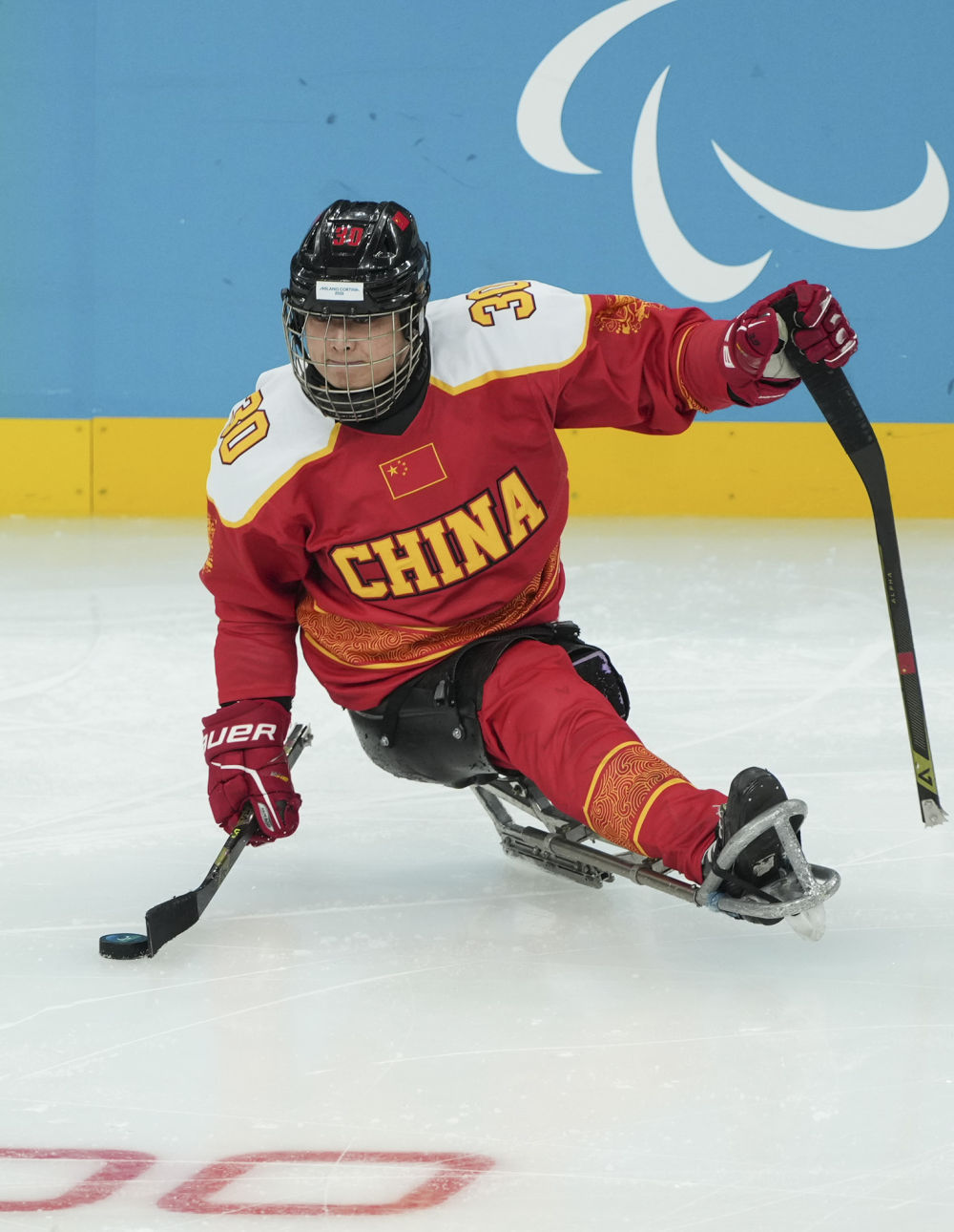 3月9日,在意大利米兰举行的米兰-科尔蒂纳冬残奥会残奥冰球小组赛A组比赛中,中国队11:1战胜意大利队。图为中国队球员邱殿棚在比赛中控球。新华社记者 侯俊 摄