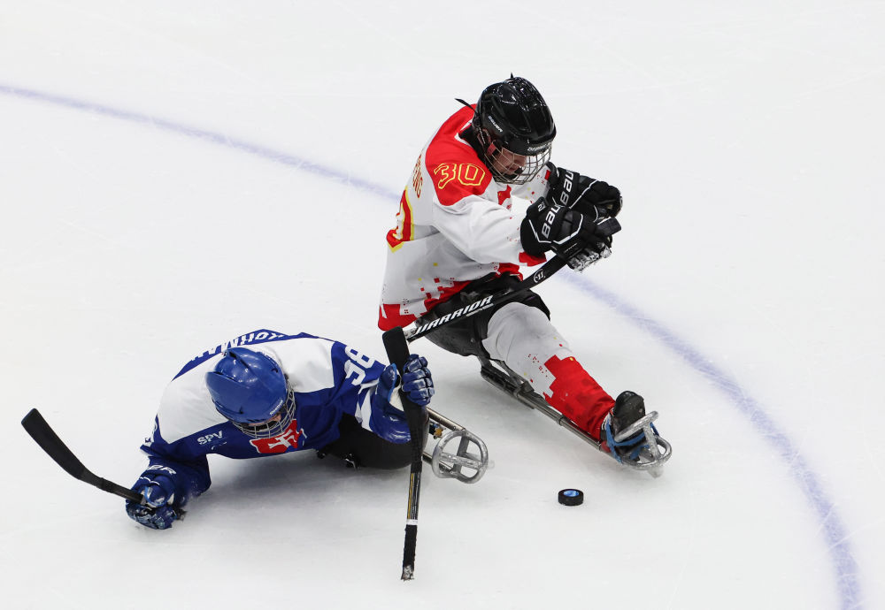 2022年3月5日,在国家体育馆举行的北京冬残奥会残奥冰球小组赛中,中国队以7:0战胜斯洛伐克队。图为邱殿棚(右)在比赛中拼抢。新华社记者 张可任 摄
