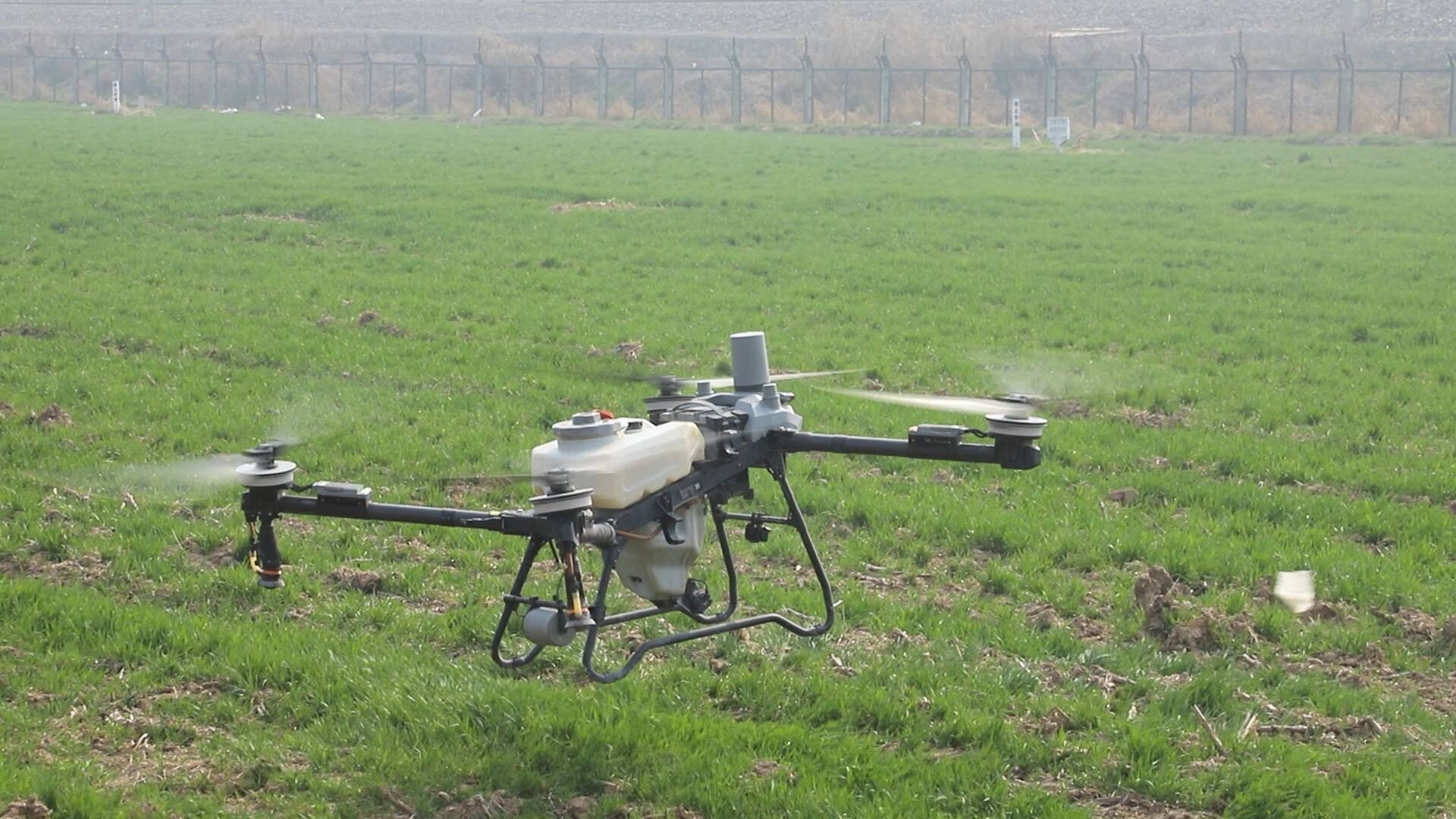 在现场,无人机装满农药和植物调节剂,随着机手的操纵,它腾空而起,沿着预设航线匀速飞行,将调配好的药剂均匀雾化喷洒在麦苗上,展现出一幅美丽的画面。