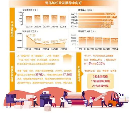 放眼青岛,纺织产业正乘着“智造”东风,再造产业发展新优势。2024年,青岛纺织服装规上企业营收达357亿元,利润总额同比增长17.36%。